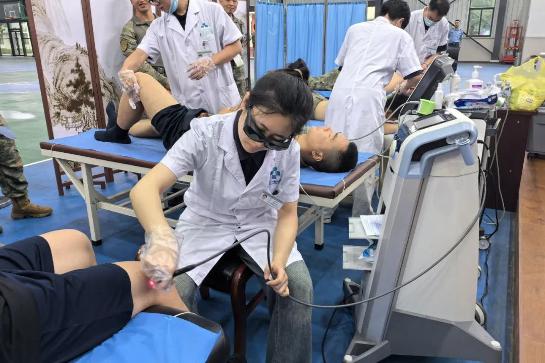使用体外冲击波治疗仪的医生上演着“巧劲与蛮力”的碰撞,为了保证更好的治疗效果,他们会根据病情调整操作力度。使用高能量激光治疗仪的女医生则又酷又飒,戴上防护眼罩后用笔在士兵受损部位简单标记后,就开始细致操作。“微微发热是正常现象,要是有灼烧感一定和我说。”她一边扫射损伤部位,一边温柔细语地说。