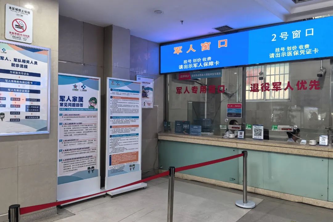 从踏进成都八一骨科医院门诊大厅开始,“军”字就无处不在。墙上、玻璃上、标牌上、门头上、大屏上、座位上,处处都有“军人第一、军属优先”“军人专属”等字样,大厅悬挂的标牌上也清晰地展示了为军“五个一”服务、“五个零、六优先”政策、军人军属就诊流程等为军服务内容。